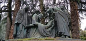 La cappella funeraria della famiglia Gaetano Colombo si impone nel Campo 6 come uno dei complessi scultorei più intensi e drammatici del Cimitero Urbano di Monza.