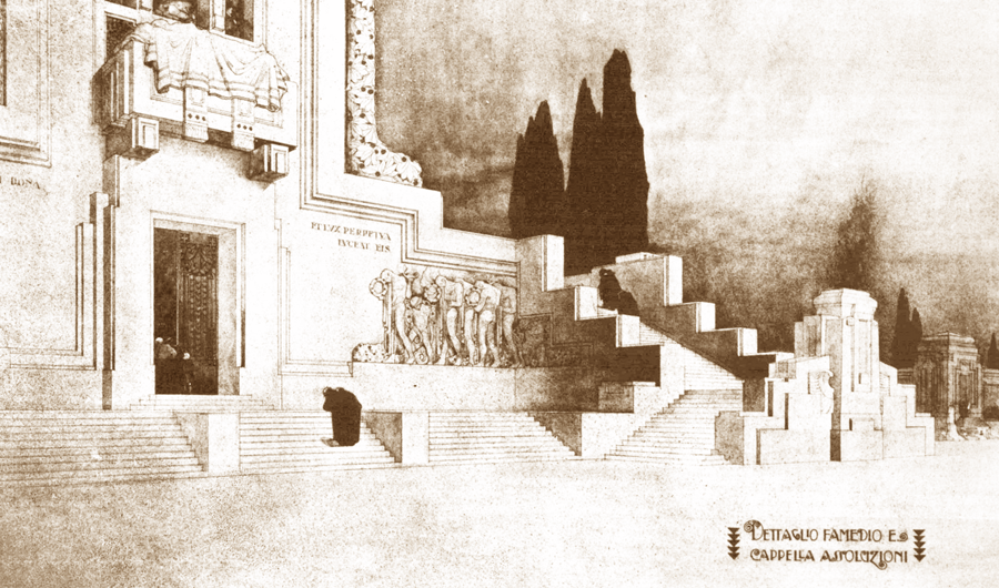 L’accesso principale avrebbe dovuto costituire un punto di forte impatto simbolico: una facciata rialzata, preceduta da una scalinata, con apparati scultorei capaci di introdurre il visitatore a una dimensione di raccoglimento e meditazione. L’idea era quella di un luogo non solo funzionale, ma capace di educare visivamente al senso del limite e della memoria.